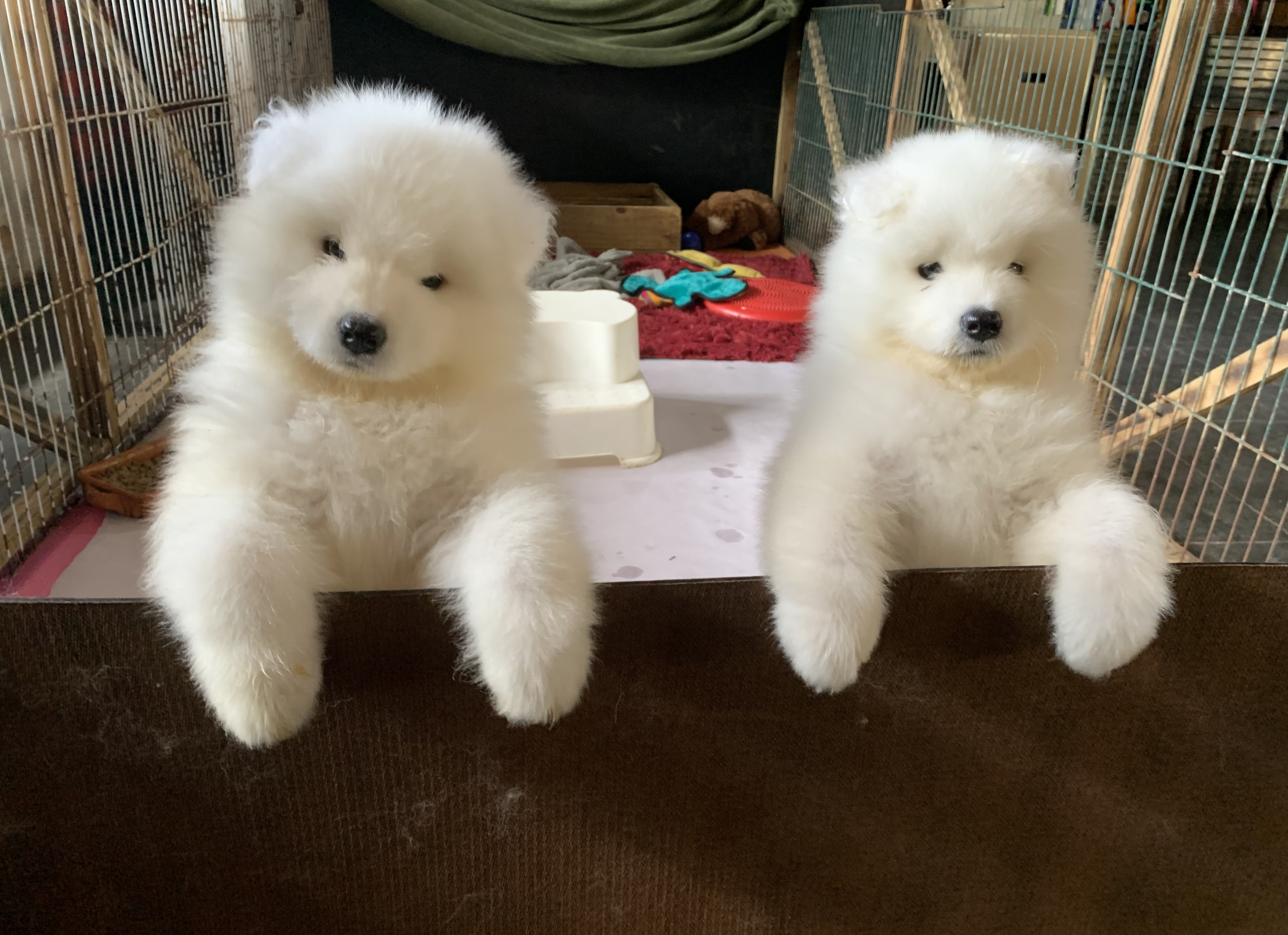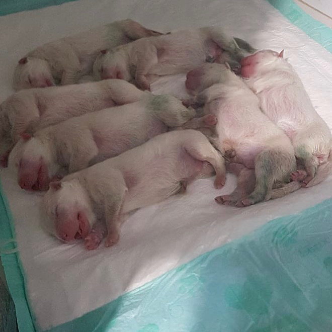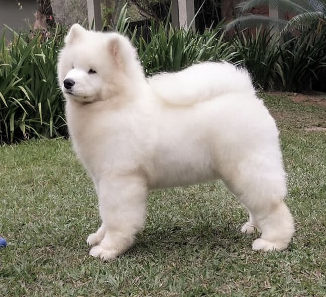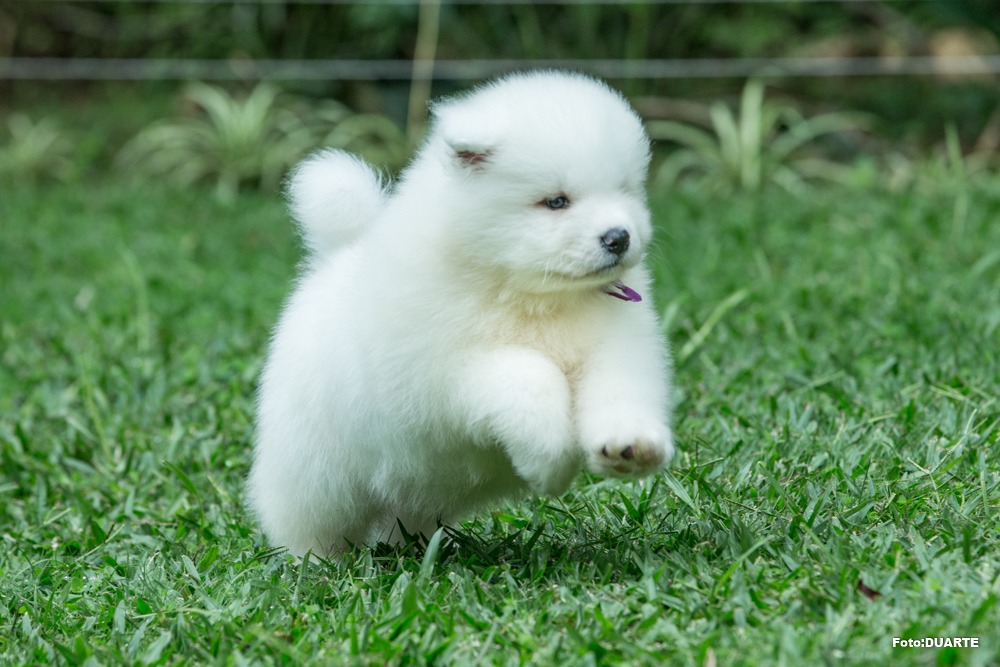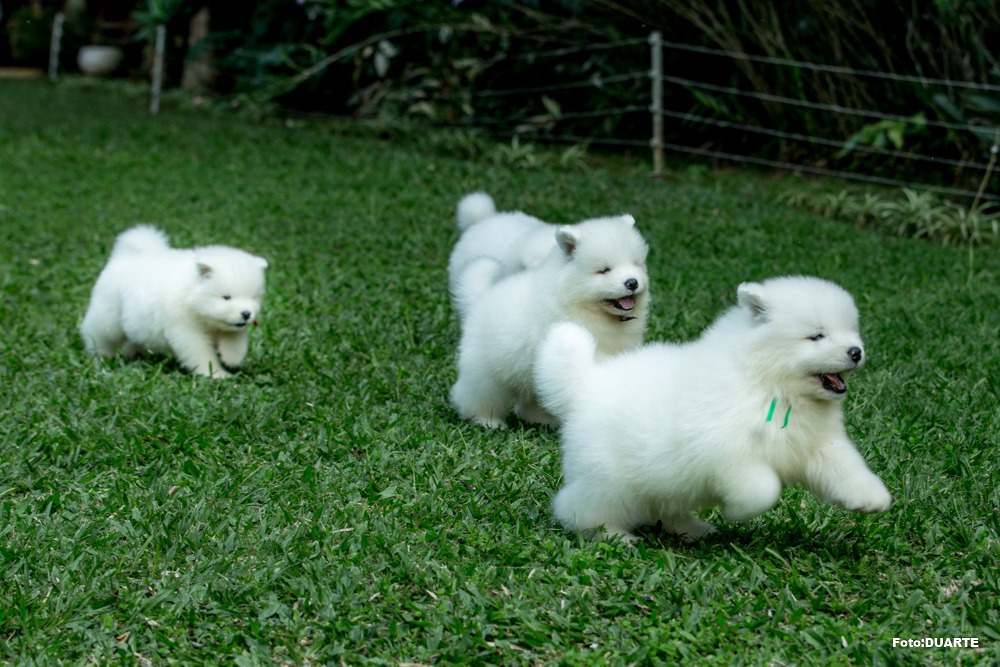 Os Samoiedas nascem brancos, com as extremidades rosadas, tais como focinhos e patas. O peso aproximado será de 0,300 a 0,400 gr.