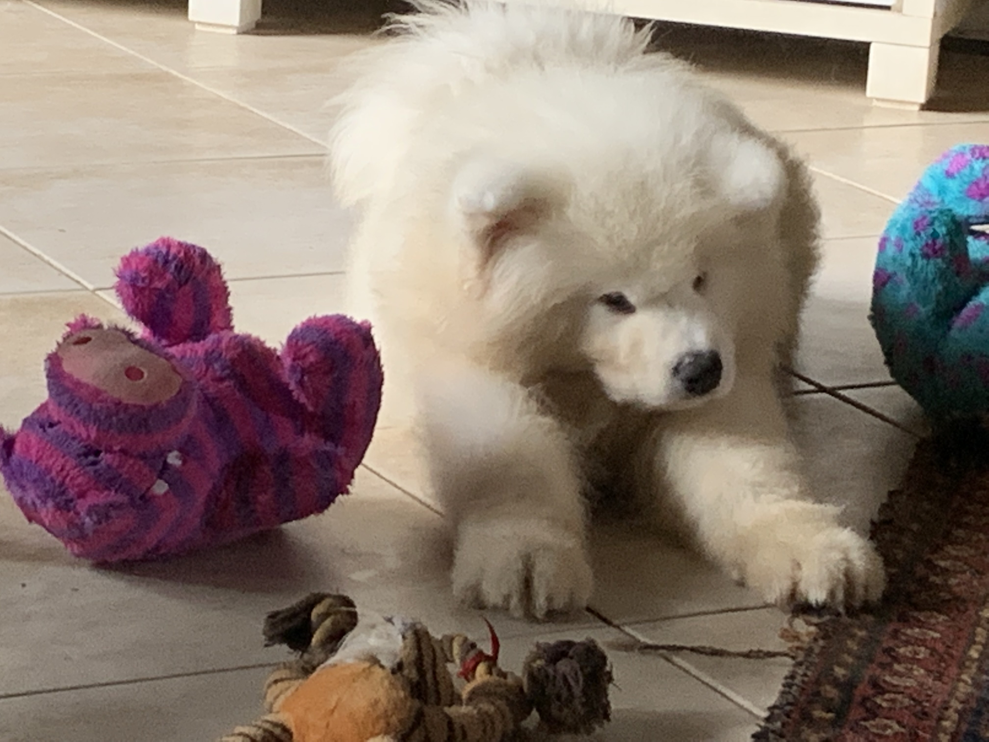 A interação com diversas pessoas da casa se torna rotina, e acabam por confiar em todos que chegam para brincar, desenvolvendo um temperamento franco e alegre como deve ser um Samoieda.