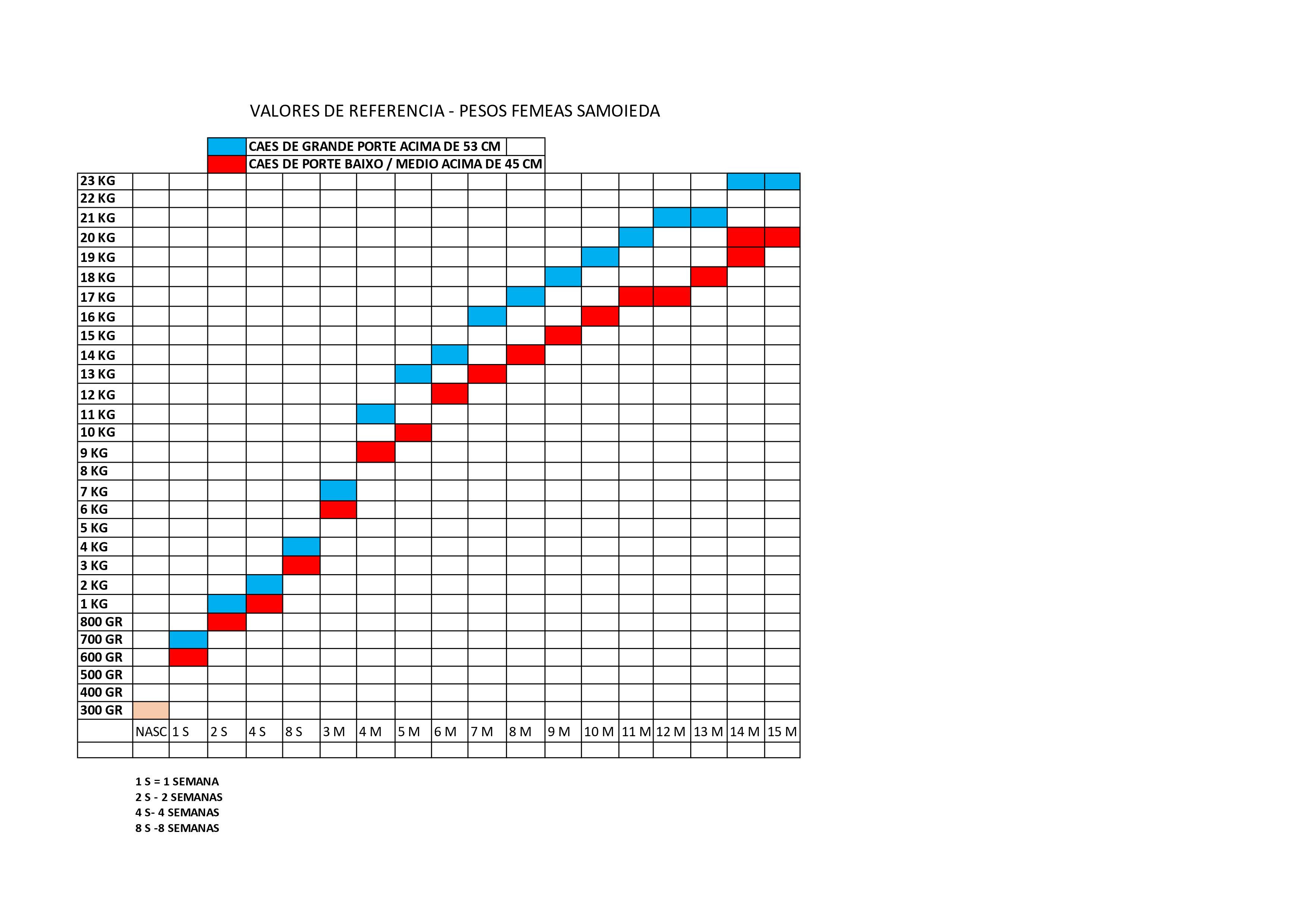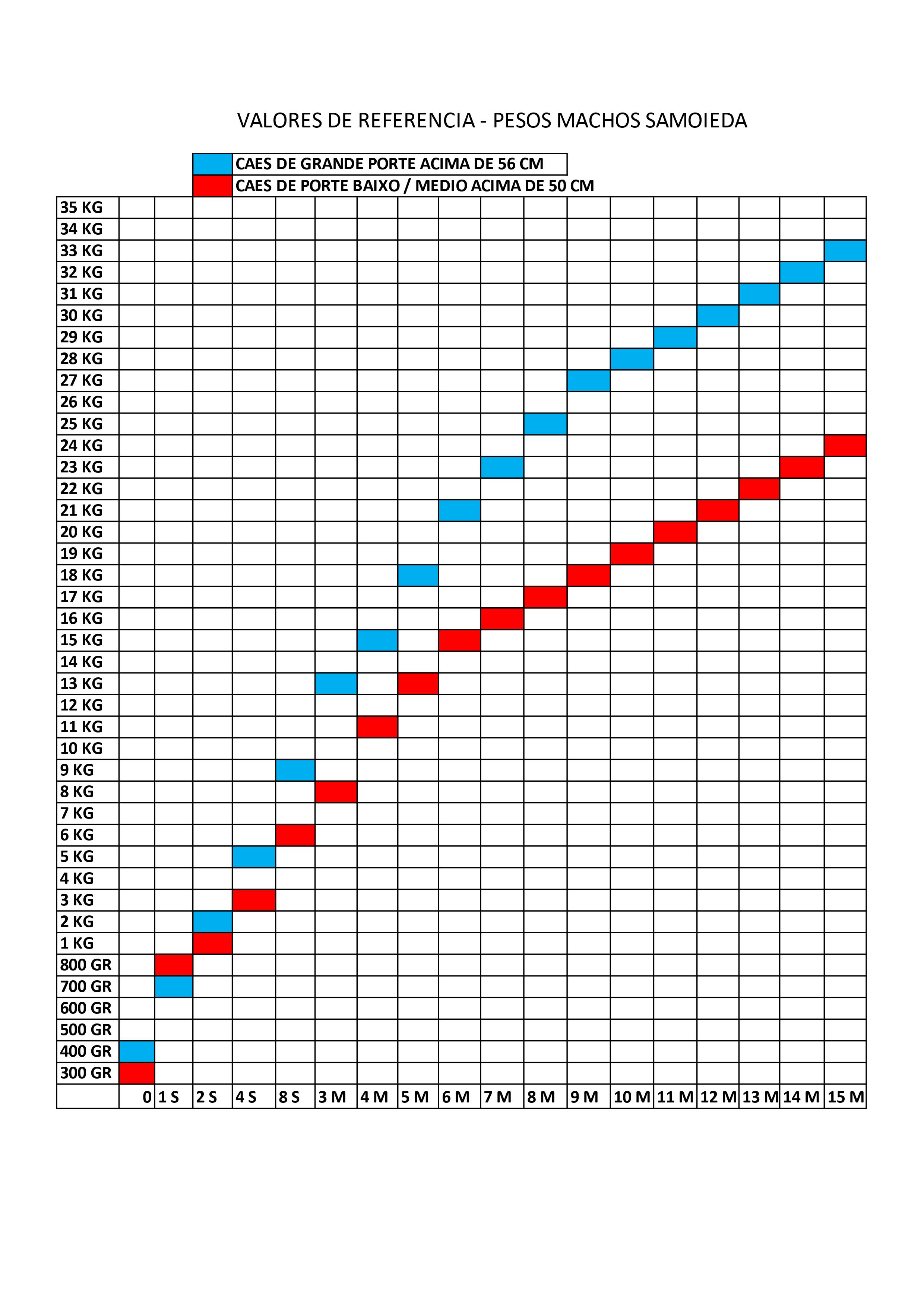 A linha vermelha representa Samoiedas de porte grande e a azul de porte médio